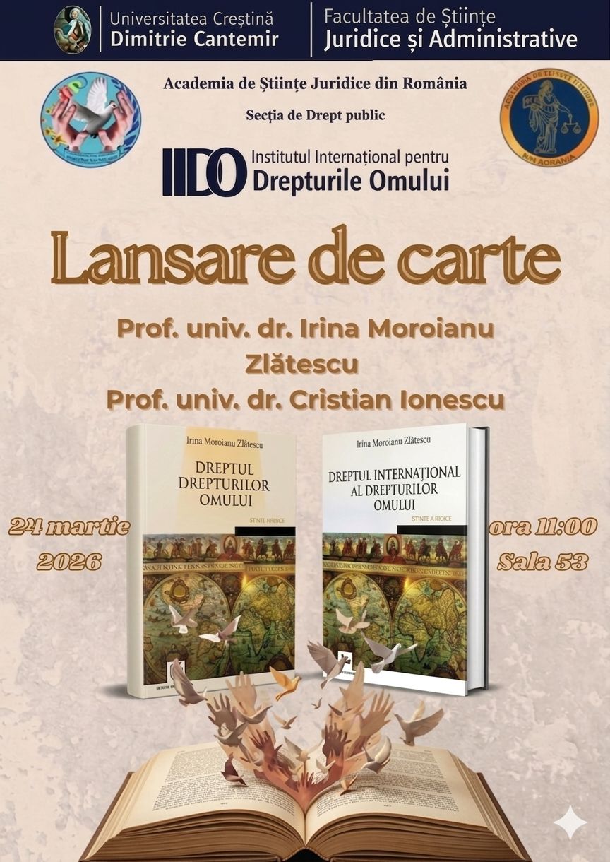 Lansare de carte organizată împreună cu Secția de drept public a Academiei de Științe Juridice din România: Dreptul internațional al drepturilor omului și Dreptul drepturilor omului, Editura Universitară, București, 2023, autoare – prof. univ. dr. Irina Moroianu Zlătescu. Responsabil de proiect și moderator: prof. univ. dr. Cristian Ionescu